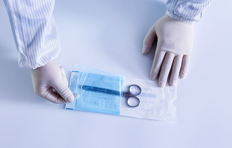 2.軟性的可撥開的組合袋,組合袋的典形結構是,一面是膜,另一面是膜、紙或非織造布。袋子常以預成形無菌屏障系統的形式供應。袋體除了留一個開口(一般是底部)外,其他所有的密封都已形成。保留的開口供裝入器械後再封口。因組合袋的寬度可以加工成各種規格,所以很多種器械都可用組合袋作為其無菌屏障系統。這些器械的特點是體積小、重量輕。袋子可以有不同的設計特徵。例如,可以是折邊袋(又稱立體袋),適合於裝入較厚的器械,也可以是平面袋。膜的作用是能再開封前看到裏面的器械, 而紙的作用是能使滅菌劑(蒸汽、環氧乙烷氣體)進入包裝。